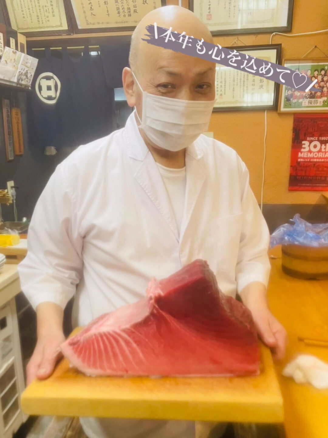 写真は、今年最初の仕入れとなるマグロと大将です。